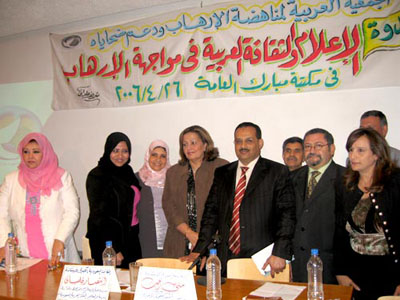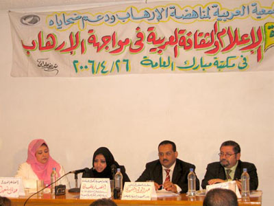 ثم تحدثت الفنانة عفاف شعيب حول دور الفن في مكافحة الارهاب ودعت إلى عمل فيلم عربي بتمويل مشترك ليظهر الوجه الحقيقي للارهاب وتساءلت من وراء هذه الأحداث الارهابية ومن هو الممول والمستفيد الرئيسي من زعزعة الامن والاستقرار الوطني.