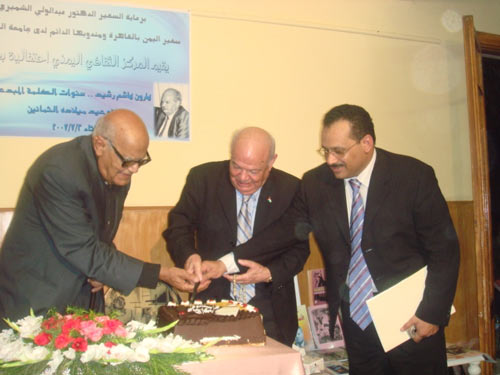لدكتور الشميري والشاعر هارون هاشم والناقد محمد التهامي وهم يحتفلون بعيد ميلاد الشاعر هارون هاشم