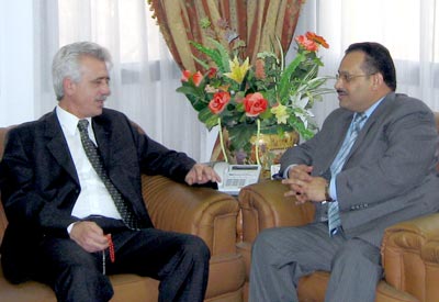 التقى سعادة الدكتور عبد الولي الشميري سفير الجمهورية اليمنية لدى مصر ومندوبها الدائم لدى جامعة الدول العربية يوم الثلاثاء الموافق 21/3/2006م في مكتبه بمبنى السفارة بسعادة السفير حسين عبد الخالق المندوب الدائم لدولة فلسطين لدى جامعة الدول العربية، تم خلاله مناقشة عدد من قضايا الساعة، والأمور التي تهم العلاقات بين البلدين والشعبين الشقيقين، والتطورات الجارية على الصعيد الفلسطيني والعربي، كما تم التطرق إلى التحضيرات الجارية للقمة العربية في الخرطوم، والتي ستعقد أواخر الشهر الجاري. |