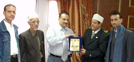 جمعية المنشدين اليمنيين التي فازت في مهرجان القاهرة للغناء الديني بعدد من الدروع والأوسمة تقدم درعها التكريمي للسفير الدكتور عبد الولي الشميري سفير اليمن بالقاهرة، والمندوب الدائم لدى جامعة الدول العربية، وذلك بدار السفارة. |
