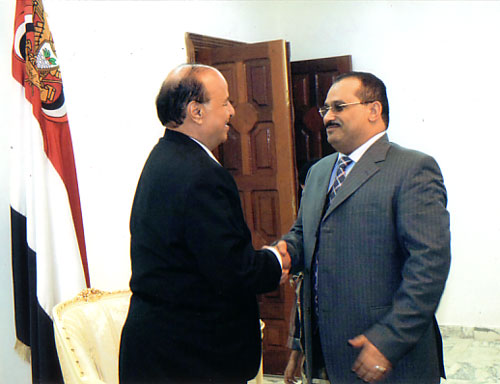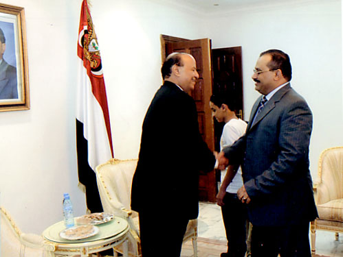 السفير د. عبدالولي الشميري يصافح اللواء عبدربه منصور هادي نائب رئيس الجمهورية ويظهر بالصورة الطفل شهاب عبدالولي الشميري