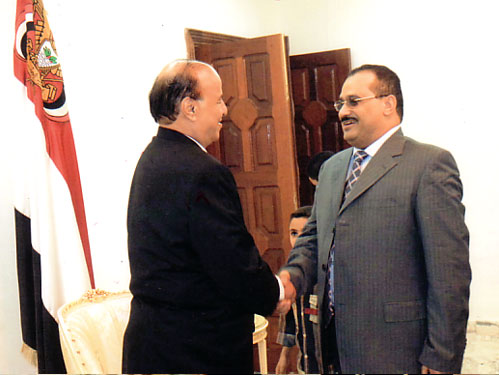 السفير د. عبدالولي الشميري يصافح اللواء عبدربه منصور هادي نائب رئيس الجمهورية ويظهر بالصورة عماد عبدالولي الشميري