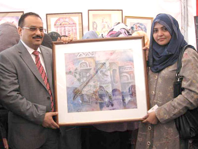 السفير د. عبدالولي الشميري يتسلم لوحة فنية من الباحثة اليمنية ابتسام العلفى