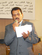 ومن ثم قرأ الرسالة الموجهة للرئيس من شباب اليمن في القاهرة محمد ضيف الله محمد الشماري رئيس نادي اتحاد شباب اليمن بجمهورية مصر العربية.