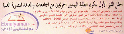 تحت شعار بالعلم نبني الاوطان أقام موقع ابن اليمن (موقع الطلبة اليمنيين بالخارج ) الحفل الفني التكريمي الاول للطلبة اليمنيين الخريجيين في الجامعات والمعاهد المصرية العليا للعام الجامعي 2005 – 2006م وذلك برعاية سفير الجمهورية اليمنية بالقاهرة د / عبد الولي الشميري وذلك على مسرح فيصل ندا