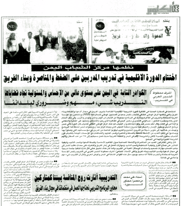 • الأستاذ/ عادل فاروق أخصائي تدريب من مصر/ الدورة التدريبية الأولى لتدريب مدربين وبناء الفريق في مجال الدعوة والضغط والمناصرة وكسب التأييد من حيث موضوعاتها وعناوينها ومناسبتها للمتدربين وتفاعلهم معها من خلال المشاركة والنقاش يظهر لي مدى توفيق القائمين عليها في اختيار موضوعاتها وإدارتها وحرص المركز الوطني الثقافي للشباب في اليمن على الاهتمام بتأهيل كوادر قيادية مؤثرة أتمنى لها مستقبلا حافلا بالعطاء في مجال التدريب في اليمن الشقيق.