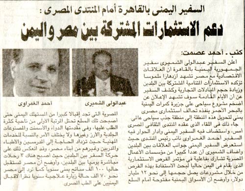 جاء ذلك في اللقاء الذي عقده المنتدى الثقافي المصري أمس, واستضاف فيه السفير اليمني وأدار الحوار فيه السفير أحمد الغمراوي نائب رئيس المنتدى حيث استعرض السفير اليمني جوانب العلاقات بين البلدين واضاف الشميري أن عددا كبيرا من مؤسسات الأعمال المصرية تشارك بفاعلية في مؤتمر الفرص الاستثمارية الذى يقام في اليمن حاليا لبحث الاستفادة بهذه الفرص من خلال مشروعات يصل حجمها إلى نحو 12 مليار دولار, وأوضح ان الأسواق اليمنية مفتوحة أمام السلع المصرية التي تجد إقبالا كبيرا من المستهلك اليمني حتى أصبحت تلك السلع تحتل المرتبة الأولى من ناحية كثرة الطلب عليها, وفي مقدمتها الدواء والأسمنت والمصنوعات الجلدية والأرز وغيرها ولا يختلف الأمر بالنسبة للخدمات المهنية حيث تزداد الحاجة إلى المدرسين والأطباء والمدربين وغيرهم من أبناء مصر, وقد انعكس ذلك على حركة السفر بين البلدين حيث أصبح هناك 3 رحلات مباشرة يوميا بين البلدين,وأوضح أن مصر تستقبل حاليا 100 ألف سائح يمني سنويا كما ترد إلى مصر نحو 70 ألف حالة زيارة علاجية سنويا نظرا لاقبال اليمنيين على الطب المصري .